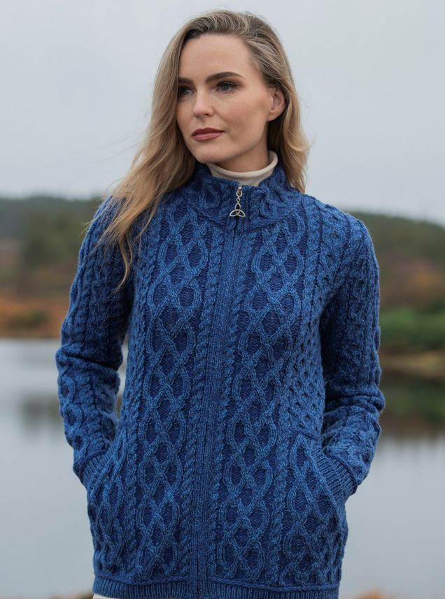 De cardigan is afgewerkt met een volledige rits, waarbij de ritstrekker is vormgegeven als een Keltische knoop – een mooie verwijzing naar het Ierse erfgoed. Dankzij de zachte merinowol, comfortabele pasvorm en handige zijzakken is dit een stijlvol en praktisch kledingstuk voor dagelijks gebruik.