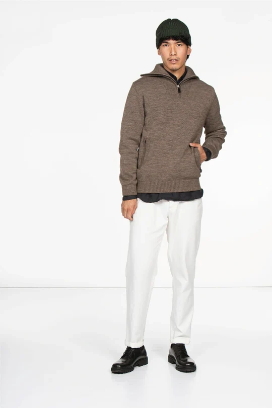 100% wollen schipperstrui met windichte voering en insteekzakken met rits afsluitbaar . Een trui die draagt als een jas. Door de 100% wollen garens is de trui van nature een beetje vettig en dus waterafstotend. Je kan de trui dus ook prima gebruiken voor outdoor activiteiten, zoals skiën of golfen.