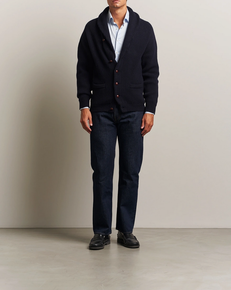De cardigan is gebreid van 100% lamswol, wat zorgt voor een zachte, warme en ademende kwaliteit. Dankzij de klassieke sjaalkraag, twee praktische voorzakken en knoopsluiting heeft dit vest een verfijnde uitstraling met een vleugje casual comfort. Perfect om te dragen over een overhemd of T-shirt, zowel thuis als op kantoor.
